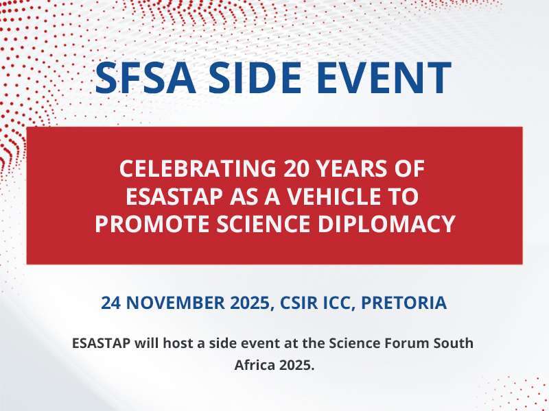 ESASTAP will host a side event titled “Celebrating 20 Years of ESASTAP as a Vehicle to Promote Science Diplomacy” at the Science Forum South Africa 2025. The event will take place 24 November 2025, from 14:30 to 17:30, at the CSIR International Convention Centre (CSIR ICC) in Pretoria.